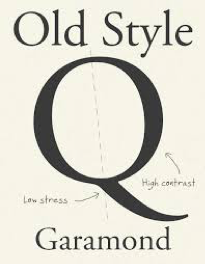 - Old Style- Roman typefaces, angled and bracketed serifs and biased stress