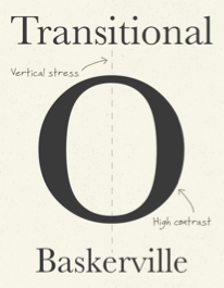 - Transitional- Serif typefaces, represent a transition from old style to modern