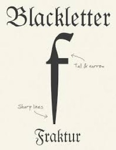 - Blackletter- Heavy stroke weight and condensed letters, few curves