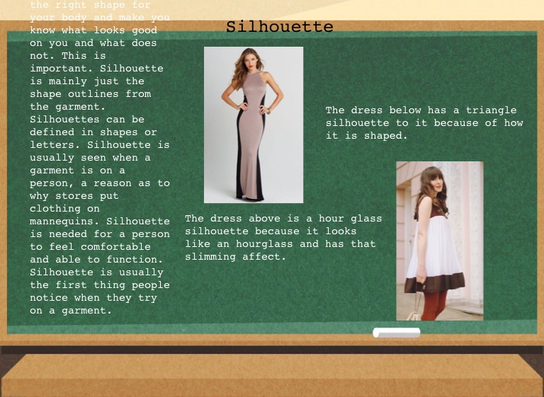 Knowing silhouettes can help you pick out the right shape for your body and make you know what looks good on you and what does not. This is important. Silhouette is mainly just the shape outlines from the garment. Silhouettes can be defined in shapes or letters. Silhouette is usually seen when a garment is on a person, a reason as to why stores put clothing on mannequins. Silhouette is needed for a person to feel comfortable and able to function. Silhouette is usually the first thing people notice when they try on a garment.
