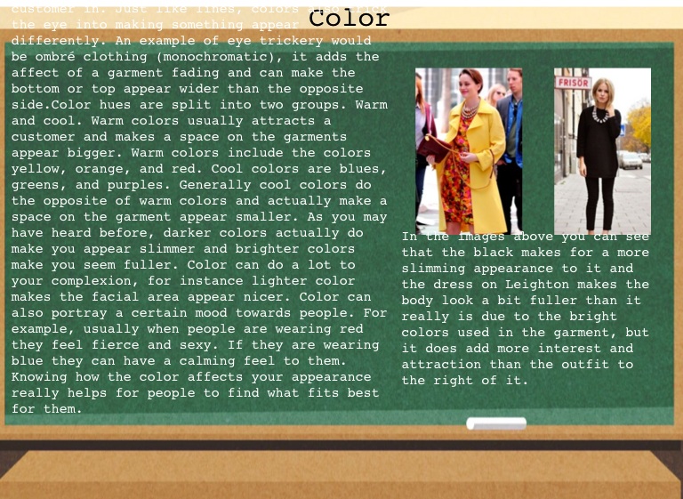Color plays a very important role in garments. It is one of the number one things that draws a customer in. Just like lines, colors also trick the eye into making something appear differently. An example of eye trickery would be ombré clothing (monochromatic), it adds the affect of a garment fading and can make the bottom or top appear wider than the opposite side.Color hues are split into two groups. Warm and cool. Warm colors usually attracts a customer and makes a space on the garments appear bigger. Warm colors include the colors yellow, orange, and red. Cool colors are blues, greens, and purples. Generally cool colors do the opposite of warm colors and actually make a space on the garment appear smaller. As you may have heard before, darker colors actually do make you appear slimmer and brighter colors make you seem fuller. Color can do a lot to your complexion, for instance lighter color makes the facial area appear nicer. Color can also portray a certain mood towards people. For example, usually when people are wearing red they feel fierce and sexy. If they are wearing blue they can have a calming feel to them. Knowing how the color affects your appearance really helps for people to find what fits best for them.