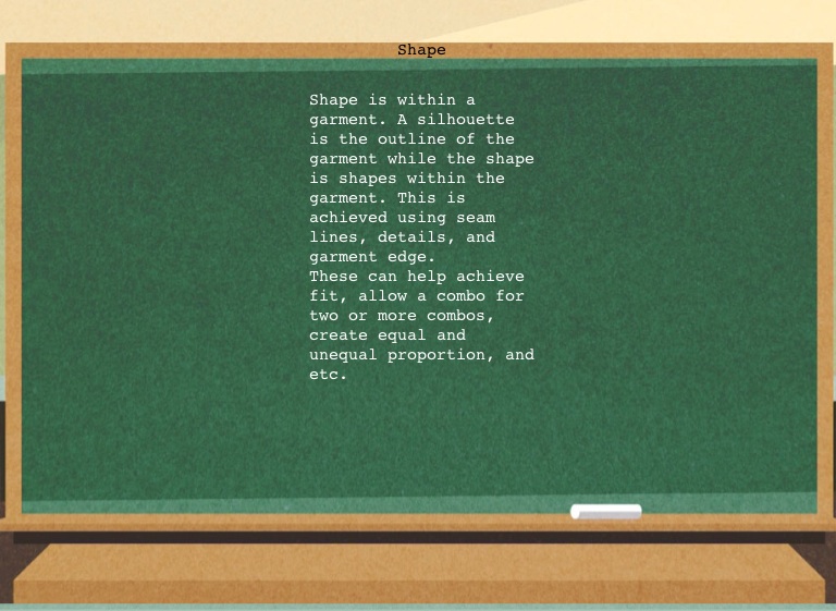 Shape is within a garment. A silhouette is the outline of the garment while the shape is shapes within the garment. This is achieved using seam lines, details, and garment edge.