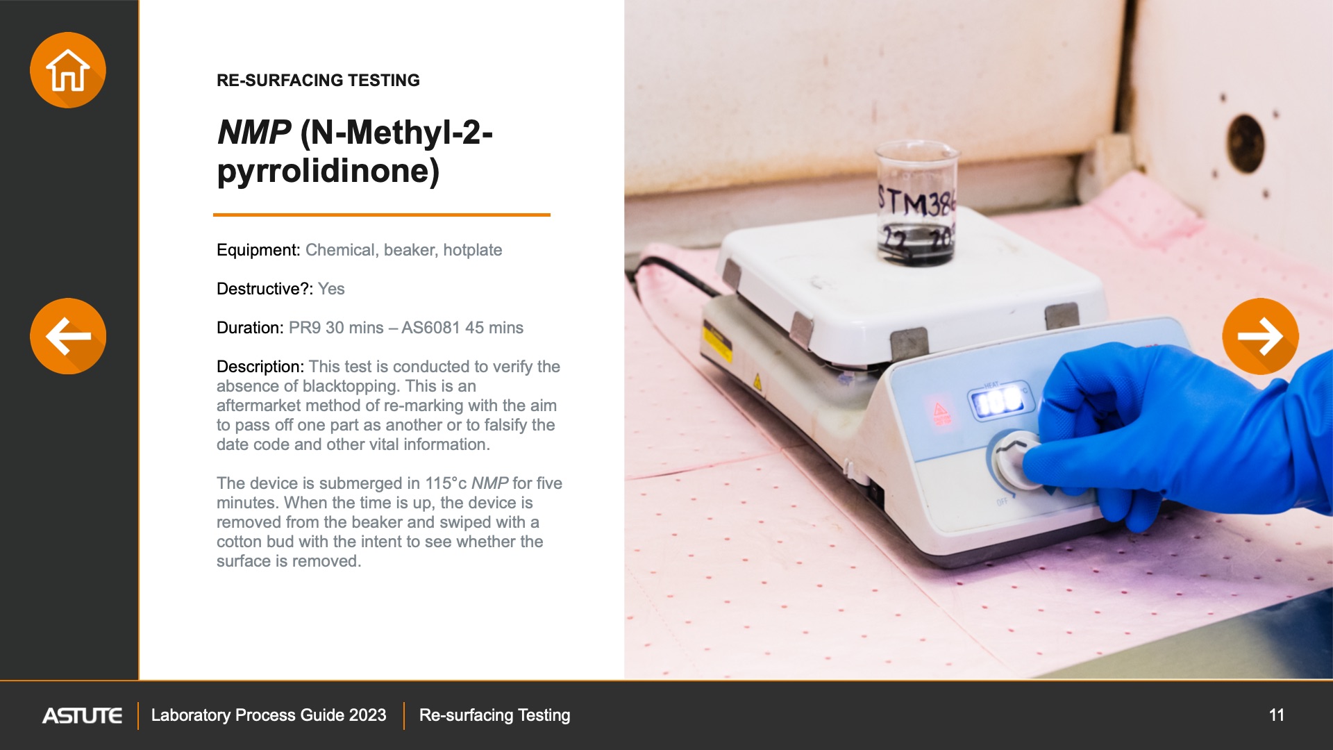 Description: This test is conducted to verify the absence of blacktopping. This is an aftermarket method of re-marking with the aim to pass off one part as another or to falsify the date code and other vital information.