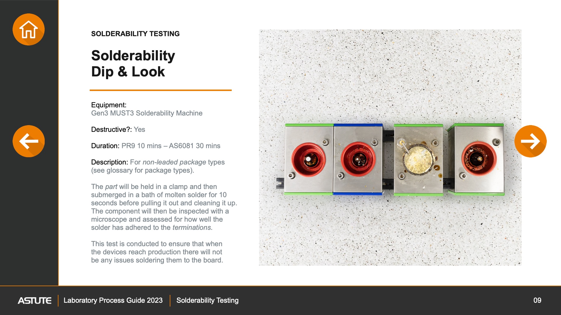 The part will be held in a clamp and then submerged in a bath of molten solder for 10 seconds before pulling it out and cleaning it up. The component will then be inspected with a microscope and assessed for how well the solder has adhered to the terminations.