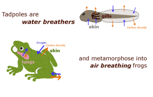 - frog tadpoles use large tail fins (contain blood vessels)