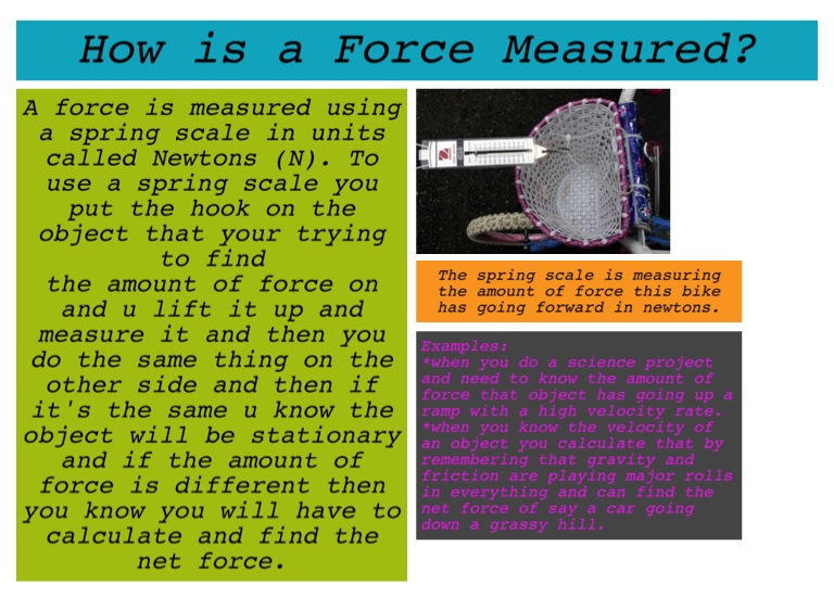 A force is measured using a spring scale in units called Newtons (N). To use a spring scale you put the hook on the object that your trying to find