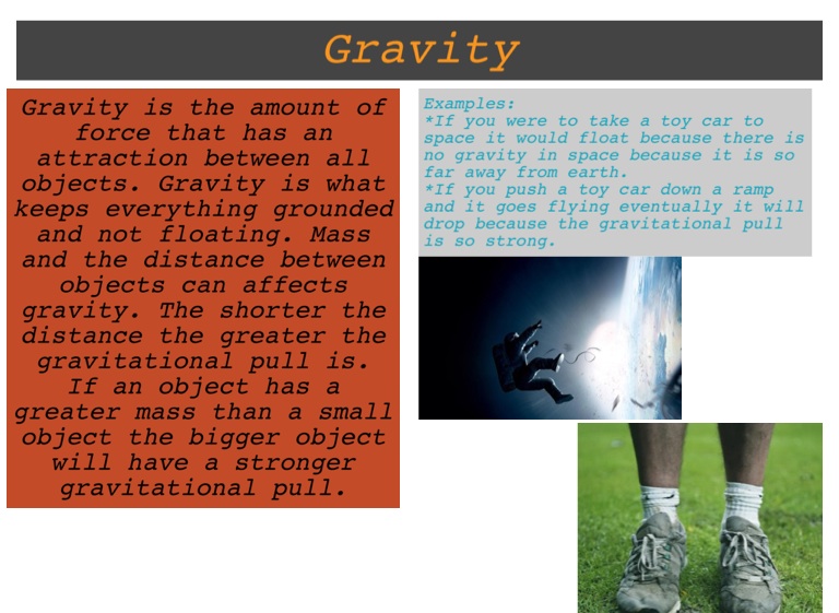 Gravity is the amount of force that has an attraction between all objects. Gravity is what keeps everything grounded and not floating. Mass and the distance between objects can affects gravity. The shorter the distance the greater the gravitational pull is. If an object has a greater mass than a small object the bigger object will have a stronger gravitational pull.