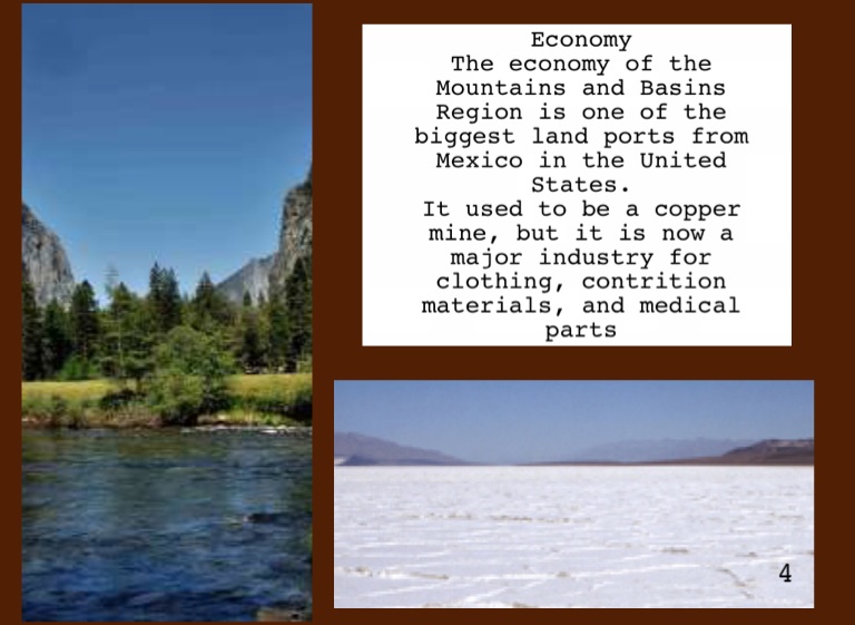 The economy of the Mountains and Basins Region is one of the biggest land ports from Mexico in the United States.