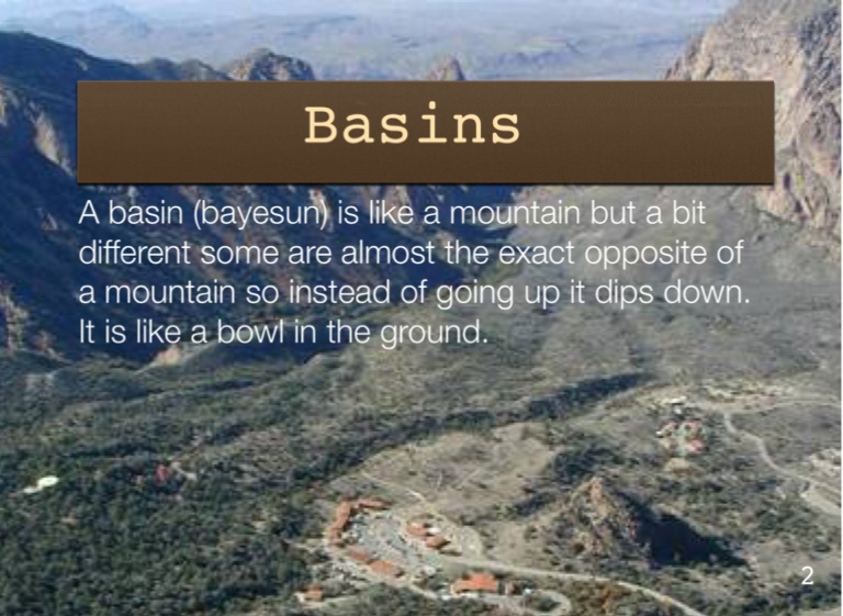 A basin (bayesun) is like a mountain but a bit different some are almost the exact opposite of a mountain so instead of going up it dips down. It is like a bowl in the ground.