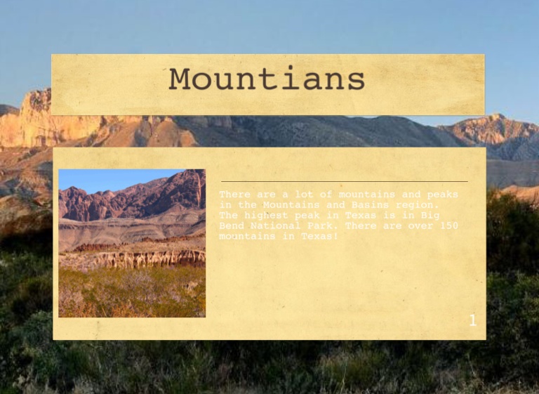 There are a lot of mountains and peaks in the Mountains and Basins region. The highest peak in Texas is in Big Bend National Park. There are over 150 mountains in Texas!