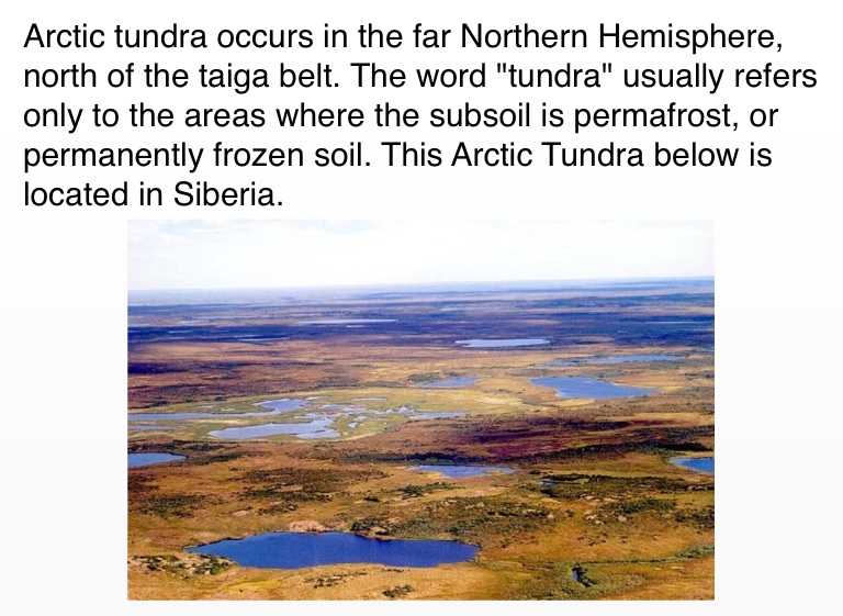 Arctic tundra occurs in the far Northern Hemisphere, north of the taiga belt. The word "tundra" usually refers only to the areas where the subsoil is permafrost, or permanently frozen soil. This Arctic Tundra below is located in Siberia.