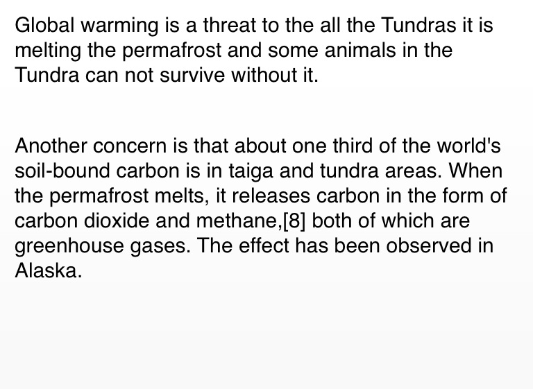 Global warming is a threat to the all the Tundras it is melting the permafrost and some animals in the Tundra can not survive without it.