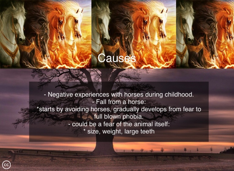 - Negative experiences with horses during childhood. - Fall from a horse: *starts by avoiding horses, gradually develops from fear to full blown phobia. - could be a fear of the animal itself: * size, weight, large teeth