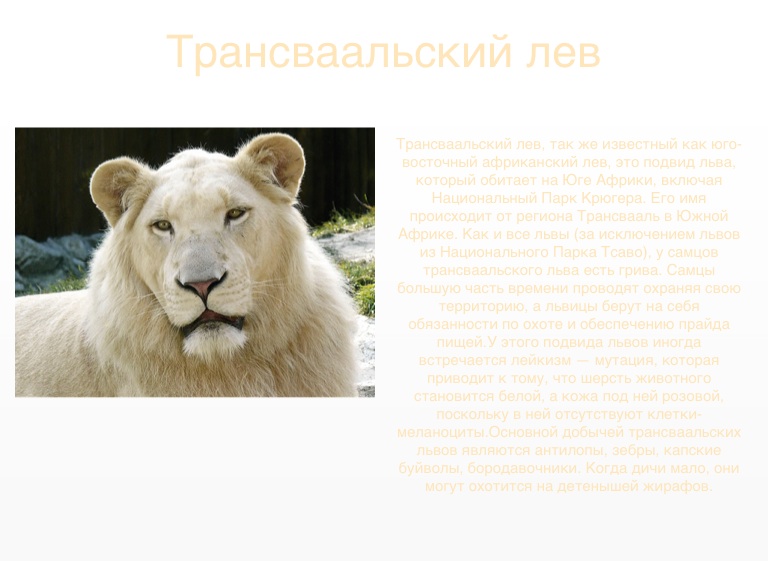 Трансваальский лев, так же известный как юго-восточный африканский лев, это подвид льва, который обитает на Юге Африки, включая Национальный Парк Крюгера. Его имя происходит от региона Трансвааль в Южной Африке. Как и все львы (за исключением львов из Национального Парка Тсаво), у самцов трансваальского льва есть грива. Самцы большую часть времени проводят охраняя свою территорию, а львицы берут на себя обязанности по охоте и обеспечению прайда пищей.У этого подвида львов иногда встречается лейкизм — мутация, которая приводит к тому, что шерсть животного становится белой, а кожа под ней розовой, поскольку в ней отсутствуют клетки-меланоциты.Основной добычей трансваальских львов являются антилопы, зебры, капские буйволы, бородавочники. Когда дичи мало, они могут охотится на детенышей жирафов.