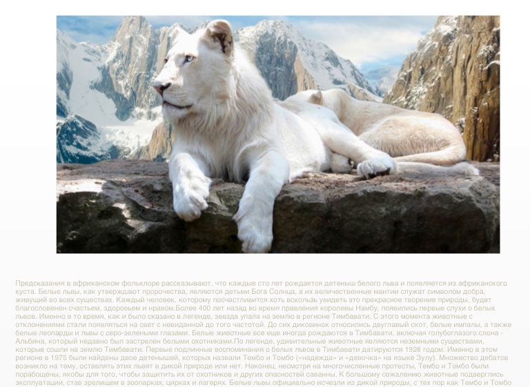 Предсказания в африканском фольклоре рассказывают, что каждые сто лет рождается детеныш белого льва и появляется из африканского куста. Белые львы, как утверждают пророчества, являются детьми Бога Солнца, а их величественные мантии служат символом добра, живущий во всех существах. Каждый человек, которому посчастливится хоть вскользь увидеть это прекрасное творение природы, будет благословенен счастьем, здоровьем и нравом.Более 400 лет назад во время правления королевы Намбу, появились первые слухи о белых львов. Именно в то время, как и было сказано в легенде, звезда упала на землю в регионе Тимбавати. С этого момента животные с отклонениями стали появляться на свет с невиданной до того частотой. До сих диковинок относились двуглавый скот, белые импалы, а также белые леопарды и львы с серо-зелеными глазами. Белые животные все еще иногда рождаются в Тимбавати, включая голубоглазого слона - Альбина, который недавно был застрелен белыми охотниками.По легенде, удивительные животные являются неземными существами, которые сошли на землю Тимбавати. Первые подлинные воспоминания о белых львов в Тимбавати датируются 1928 годом. Именно в этом регионе в 1975 были найдены двое детенышей, которых назвали Тембо и Томбо («надежда» и «девочка» на языке Зулу). Множество дебатов возникло на тему, оставлять этих львят в дикой природе или нет. Наконец, несмотря на многочисленные протесты, Тембо и Томбо были порабощены, якобы для того, чтобы защитить их от охотников и других опасностей саванны. К большому сожалению животные подверглись эксплуатации, став зрелищем в зоопарках, цирках и лагерях. Белые львы официально исчезли из дикой природы, с тех пор как Тембо и Томбо были заперты в клетке. Но эти данные не являются полностью верными.