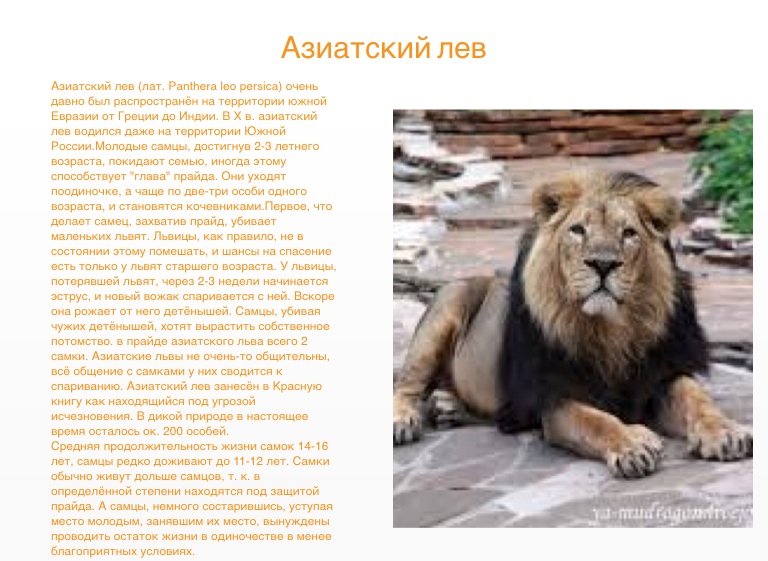 Азиатский лев (лат. Panthera leo persica) очень давно был распространён на территории южной Евразии от Греции до Индии. В Х в. азиатский лев водился даже на территории Южной России.Молодые самцы, достигнув 2-3 летнего возраста, покидают семью, иногда этому способствует "глава" прайда. Они уходят поодиночке, а чаще по две-три особи одного возраста, и становятся кочевниками.Первое, что делает самец, захватив прайд, убивает маленьких львят. Львицы, как правило, не в состоянии этому помешать, и шансы на спасение есть только у львят старшего возраста. У львицы, потерявшей львят, через 2-3 недели начинается эструс, и новый вожак спаривается с ней. Вскоре она рожает от него детёнышей. Самцы, убивая чужих детёнышей, хотят вырастить собственное потомство. в прайде азиатского льва всего 2 самки. Азиатские львы не очень-то общительны, всё общение с самками у них сводится к спариванию. Азиатский лев занесён в Красную книгу как находящийся под угрозой исчезновения. В дикой природе в настоящее время осталось ок. 200 особей.