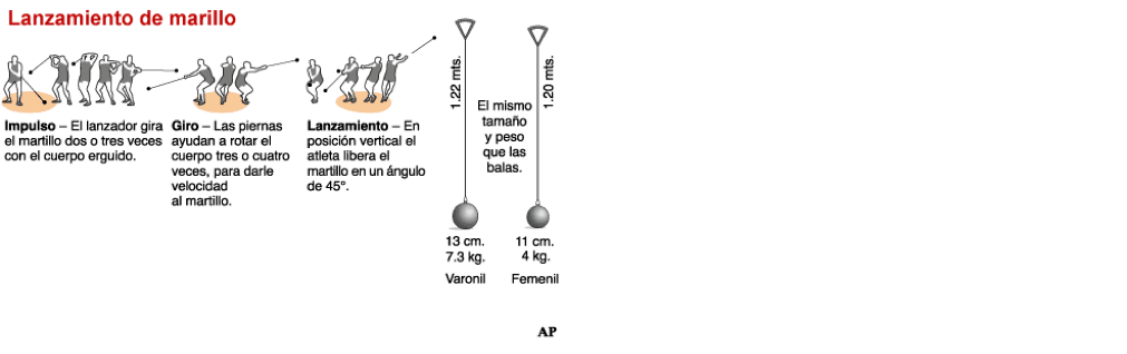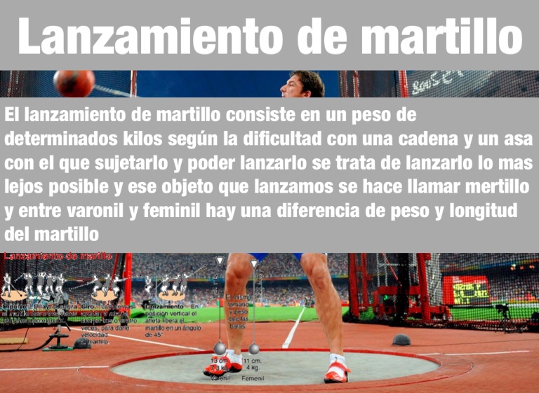 El lanzamiento de martillo consiste en un peso de determinados kilos según la dificultad con una cadena y un asa con el que sujetarlo y poder lanzarlo se trata de lanzarlo lo mas lejos posible y ese objeto que lanzamos se hace llamar mertillo y entre varonil y feminil hay una diferencia de peso y longitud del martillo