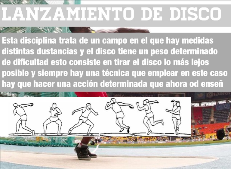 Esta disciplina trata de un campo en el que hay medidas distintas dustancias y el disco tiene un peso determinado de dificultad esto consiste en tirar el disco lo más lejos posible y siempre hay una técnica que emplear en este caso hay que hacer una acción determinada que ahora od enseñ