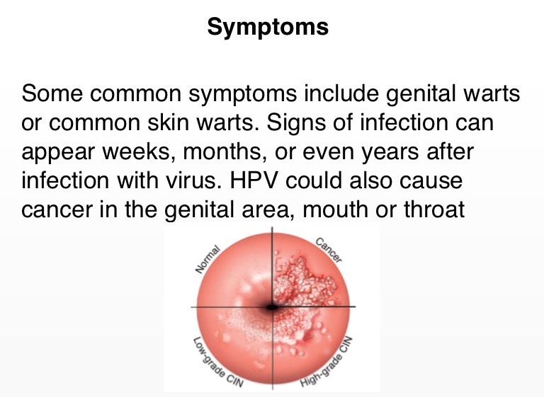 Some common symptoms include genital warts or common skin warts. Signs of infection can appear weeks, months, or even years after infection with virus. HPV could also cause cancer in the genital area, mouth or throat