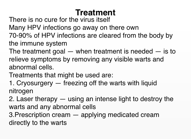 The treatment goal — when treatment is needed — is to relieve symptoms by removing any visible warts and abnormal cells.