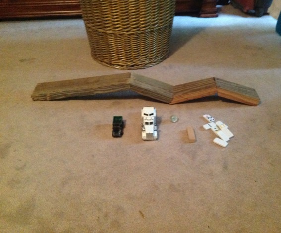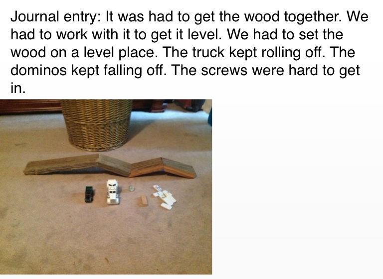 Journal entry: It was had to get the wood together. We had to work with it to get it level. We had to set the wood on a level place. The truck kept rolling off. The dominos kept falling off. The screws were hard to get in.