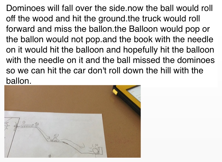 Dominoes will fall over the side.now the ball would roll off the wood and hit the ground.the truck would roll forward and miss the ballon.the Balloon would pop or the ballon would not pop.and the book with the needle on it would hit the balloon and hopefully hit the balloon with the needle on it and the ball missed the dominoes so we can hit the car don't roll down the hill with the ballon.