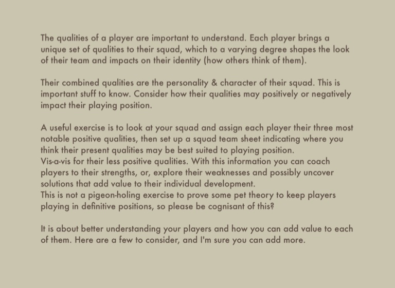 The qualities of a player are important to understand. Each player brings a unique set of qualities to their squad, which to a varying degree shapes the look of their team and impacts on their identity (how others think of them).
