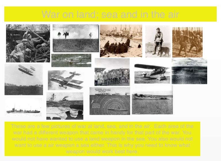 These are a few pictures of war at land, sea, and in the air. Each area of the war had a different weapon that came in handy for that part of the war. You would not have wanted to use a land weapon in the sea. You also would not want to use a air weapon a sea either. This is why you need to know what weapon would work best here.