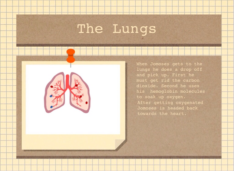 When Jomoses gets to the lungs he does a drop off and pick up. First he must get rid the carbon dioxide. Second he uses his hemoglobin molecules to soak up oxygen.
