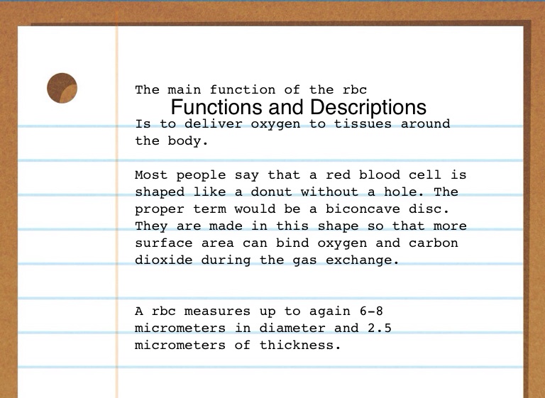Most people say that a red blood cell is shaped like a donut without a hole. The proper term would be a biconcave disc. They are made in this shape so that more surface area can bind oxygen and carbon dioxide during the gas exchange.
