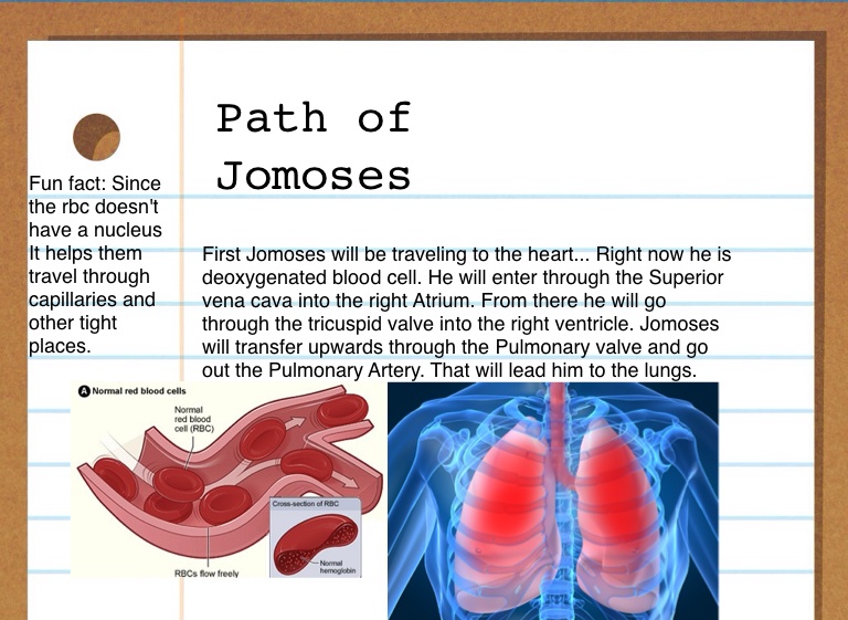 First Jomoses will be traveling to the heart... Right now he is deoxygenated blood cell. He will enter through the Superior vena cava into the right Atrium. From there he will go through the tricuspid valve into the right ventricle. Jomoses will transfer upwards through the Pulmonary valve and go out the Pulmonary Artery. That will lead him to the lungs.