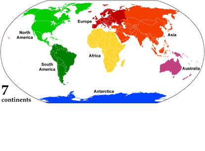The continents are North America, South America, Antarctica, Africa, Asia, Europe, and Australia.