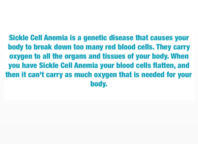 Sickle Cell Anemia is a genetic disease that causes your body to break down too many red blood cells. They carry oxygen to all the organs and tissues of your body. When you have Sickle Cell Anemia your blood cells flatten, and then it can't carry as much oxygen that is needed for your body.