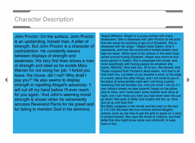 John Proctor: On the surface, John Proctor is an upstanding, honest man. A pillar of strength. But John Proctor is a character of contradiction. He constantly wavers between displays of strength and weakness. His very first lines shows a man of strength and steel as he scolds Mary Warren for not doing her job: 'I forbid you leave, the house, did I not? Why shall I pay you?' He also seems to display strength in repelling Abigail's advances: 'I will cut off my hand before I'll ever reach for you again.' And John's seeming moral strength is shown when he vehemently accuses Reverend Parris for his greed and for failing to mention God in his sermons.