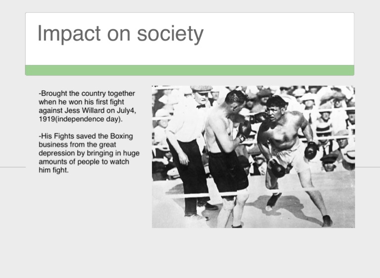 -Brought the country together when he won his first fight against Jess Willard on July4, 1919(independence day).