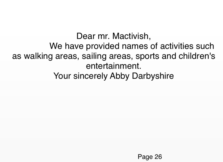 We have provided names of activities such as walking areas, sailing areas, sports and children's entertainment.