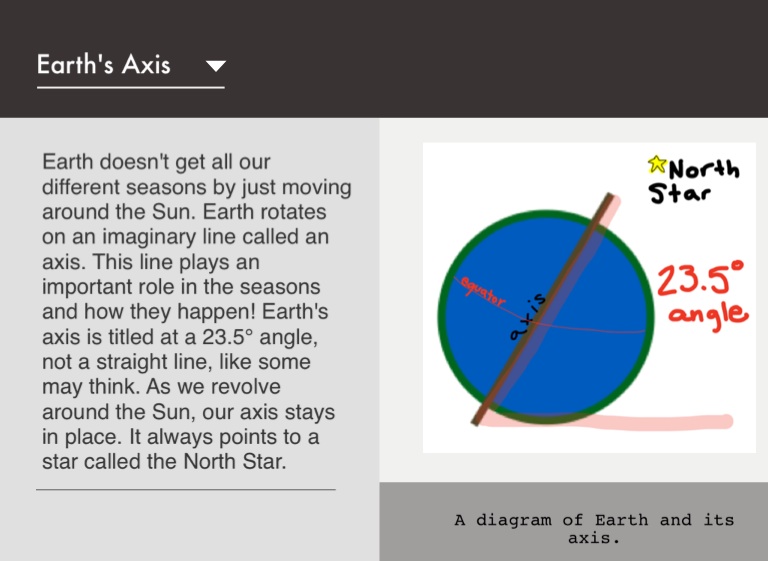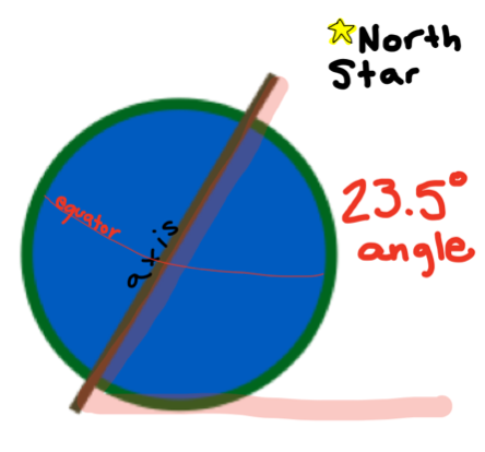 Earth doesn't get all our different seasons by just moving around the Sun. Earth rotates on an imaginary line called an axis. This line plays an important role in the seasons and how they happen! Earth's axis is titled at a 23.5° angle, not a straight line, like some may think. As we revolve around the Sun, our axis stays in place. It always points to a star called the North Star.