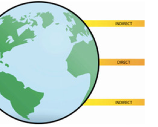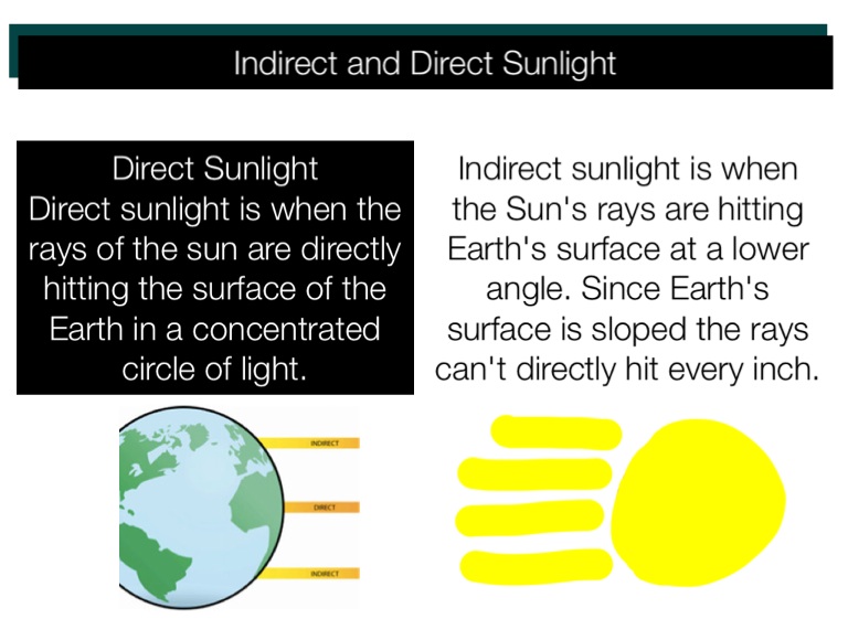 Indirect sunlight is when the Sun's rays are hitting Earth's surface at a lower angle. Since Earth's surface is sloped the rays can't directly hit every inch.