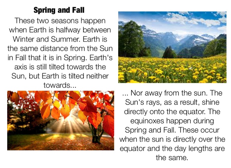 These two seasons happen when Earth is halfway between Winter and Summer. Earth is the same distance from the Sun in Fall that it is in Spring. Earth's axis is still tilted towards the Sun, but Earth is tilted neither towards...