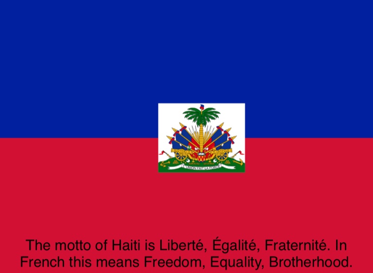 The motto of Haiti is Liberté, Égalité, Fraternité. In French this means Freedom, Equality, Brotherhood.