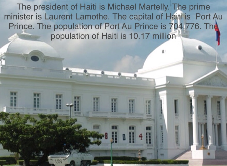 The president of Haiti is Michael Martelly. The prime minister is Laurent Lamothe. The capital of Haiti is Port Au Prince. The population of Port Au Prince is 704,776. The population of Haiti is 10.17 million