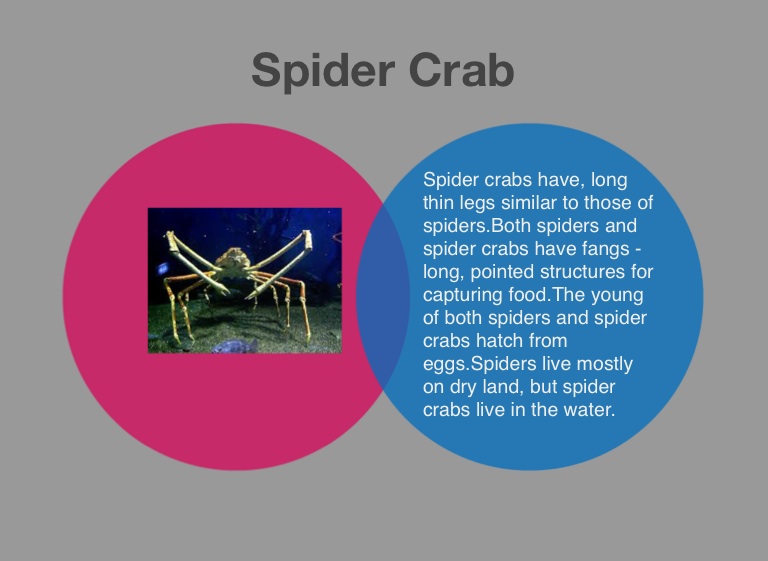 Spider crabs have, long thin legs similar to those of spiders.Both spiders and spider crabs have fangs -long, pointed structures for capturing food.The young of both spiders and spider crabs hatch from eggs.Spiders live mostly on dry land, but spider crabs live in the water.