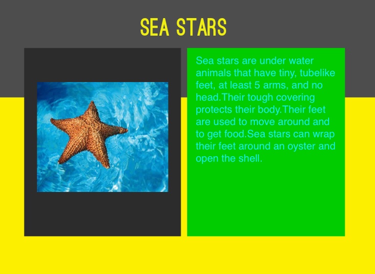 Sea stars are under water animals that have tiny, tubelike feet, at least 5 arms, and no head.Their tough covering protects their body.Their feet are used to move around and to get food.Sea stars can wrap their feet around an oyster and open the shell.