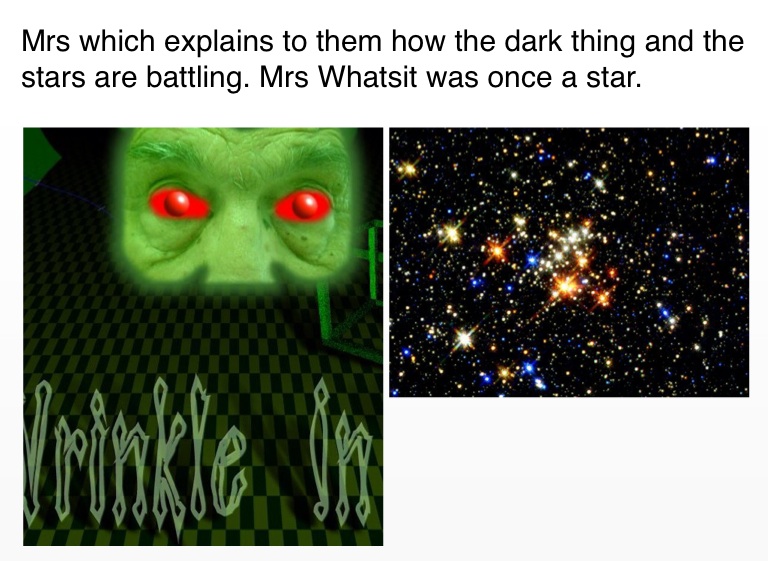 Mrs which explains to them how the dark thing and the stars are battling. Mrs Whatsit was once a star.