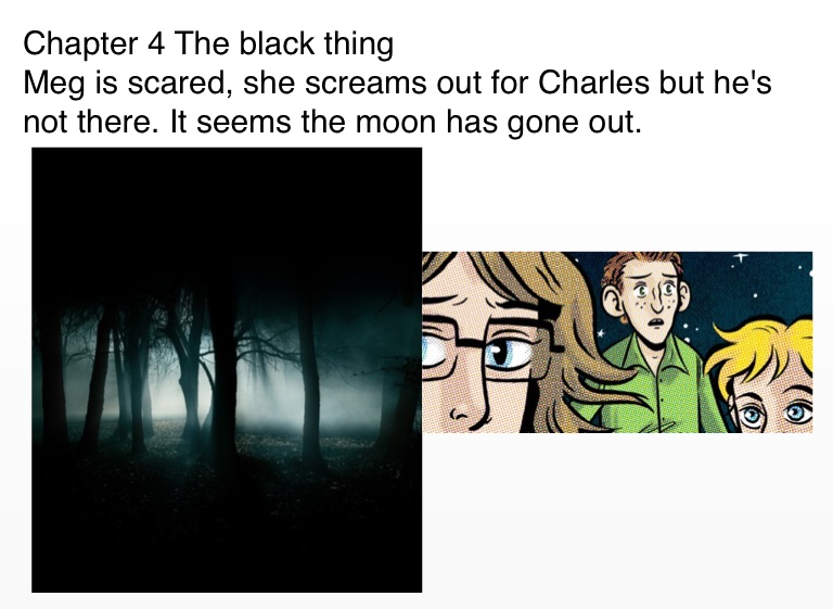 Meg is scared, she screams out for Charles but he's not there. It seems the moon has gone out.