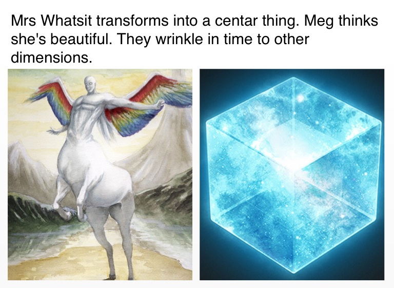 Mrs Whatsit transforms into a centar thing. Meg thinks she's beautiful. They wrinkle in time to other dimensions.