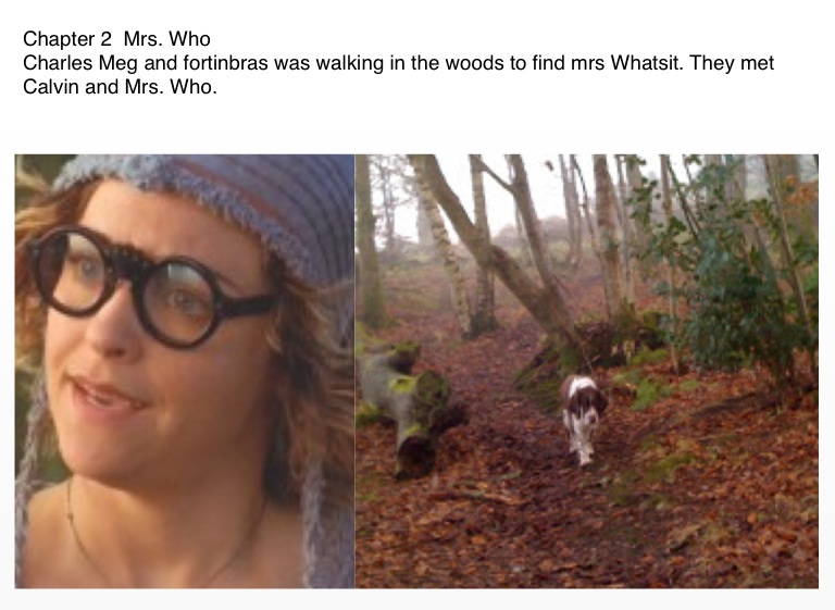 Charles Meg and fortinbras was walking in the woods to find mrs Whatsit. They met Calvin and Mrs. Who.