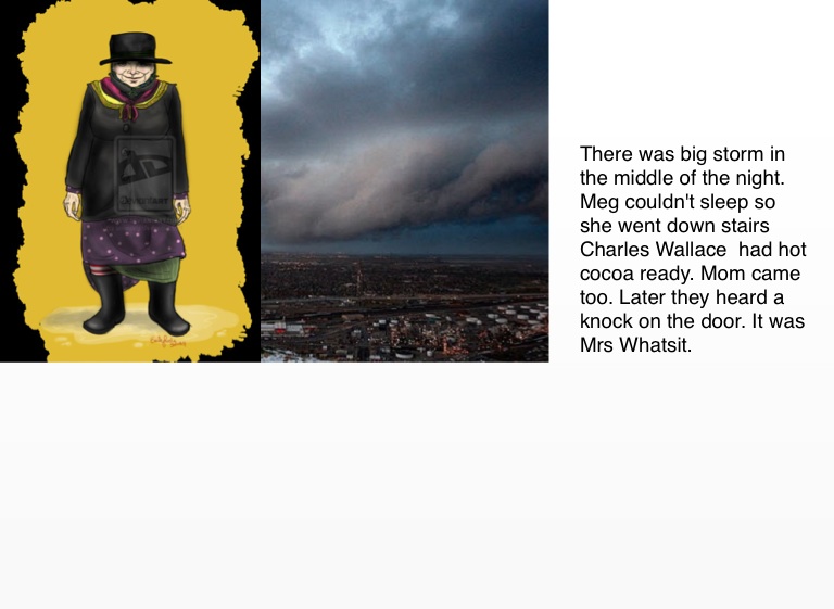 There was big storm in the middle of the night. Meg couldn't sleep so she went down stairs Charles Wallace had hot cocoa ready. Mom came too. Later they heard a knock on the door. It was Mrs Whatsit.