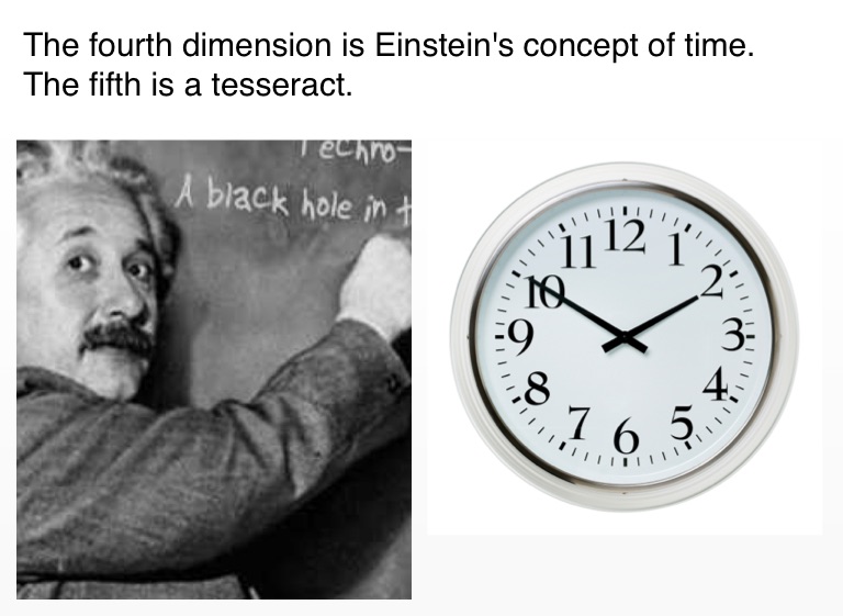 The fourth dimension is Einstein's concept of time. The fifth is a tesseract.