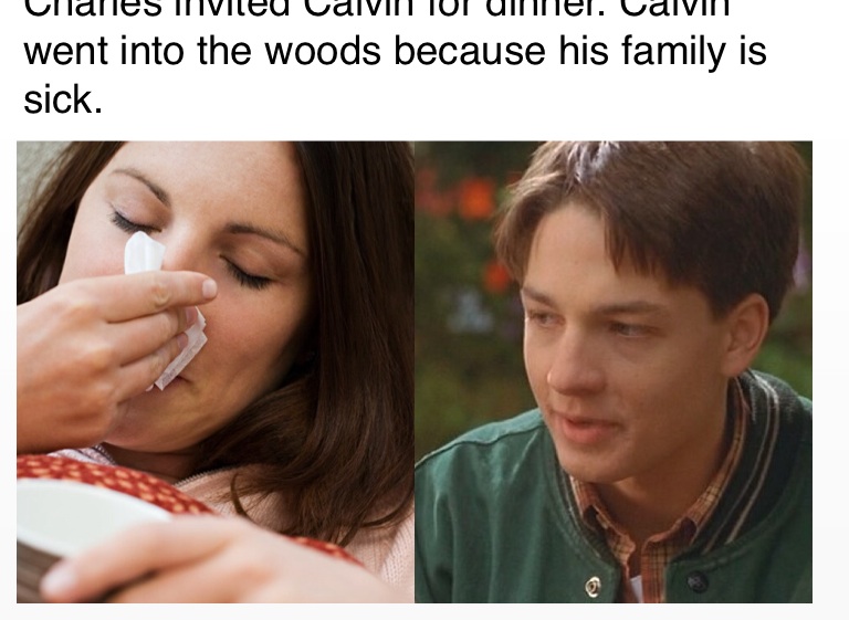 Charles invited Calvin for dinner. Calvin went into the woods because his family is sick.